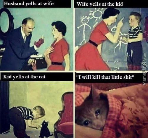 Husband Yells At Wife Kid Yells At The… meme In: m2. Husband Yells At Wife Kid Yells At The Cat Wife Yells At The Kid “I Will Kill That Little Shit” Killer jokes and comics on ComicsGoneBad. Must see. Memes and stuff! << Prev m2 Next >>