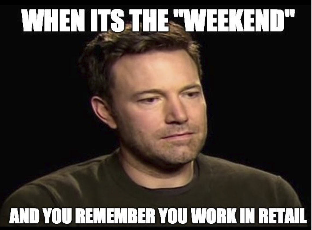WHEN “WEEKEND” AND You REMEMBER You WORK IN… In: memes. WHEN “WEEKEND” AND You REMEMBER You WORK IN RETAIL Killer jokes and comics on ComicsGoneBad. Must see. Memes and stuff! << Prev memes Next >>