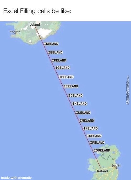 Excel Filling Cells Be Like: IDELAND IEELAND IFELAND IGELAND IHELAND…