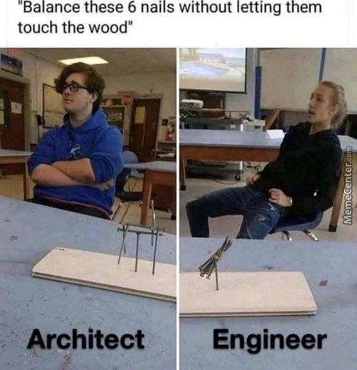 “Balance These 6 Nails Without Letting Them Touch The Wood”… In: m2. “Balance These 6 Nails Without Letting Them Touch The Wood” Architect Engineer Killer jokes and comics on ComicsGoneBad. Must see. Memes and stuff! << Prev m2 Next >>