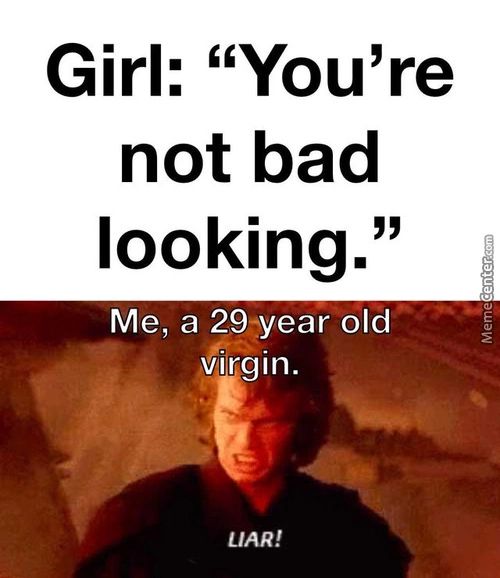 Girl: “You’re Not Bad Looking.” Me, A 29 Year Old… meme In: m2. Girl: “You’re Not Bad Looking.” Me, A 29 Year Old Virgin. UAR! Killer jokes and comics on ComicsGoneBad. Must see. Memes and stuff! << Prev m2 Next >>