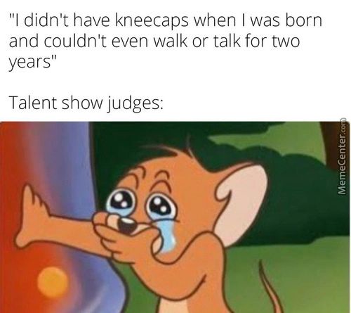 “l Didn’t Have Kneecaps When I Was Born And… meme In: m2. “l Didn’t Have Kneecaps When I Was Born And Couldn’t Even Walk Or Talk For Two Years” Talent Show Judges: Killer jokes and comics on ComicsGoneBad. Must see. Memes and stuff! << Prev m2 Next >>
