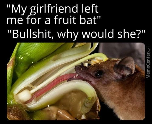 “My Girlfriend Left Me For A… meme In: m2. “My Girlfriend Left Me For A Fruit Bat” “Bullshit, Why Would She?” Killer jokes and comics on ComicsGoneBad. Must see. Memes and stuff! << Prev m2 Next >>