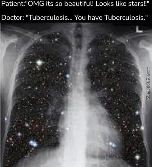 Patient:”OMG Its So Beautiful! Looks Like… meme In: m2. Patient:”OMG Its So Beautiful! Looks Like Stars!!” Doctor: “Tuberculosis… You Have Tuberculosis.” Killer jokes and comics on ComicsGoneBad. Must see. Memes and stuff! << Prev m2 Next >>